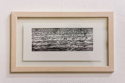 As construções crescem exacerbadamente e aparecem quase que abstraídas em imagem impressa em gravura com tela sobreposta. A Serra Da Boa Vista aparece impressa em tecido de estampa típica do interior ao lado de fundo azul de mar; se olhar bem de perto, se vê a linha de verdade que salta da tela, um detalhe que nos leva a pensar em questões humanas do que é físico e ilusório.